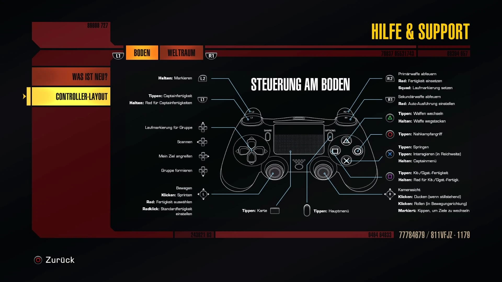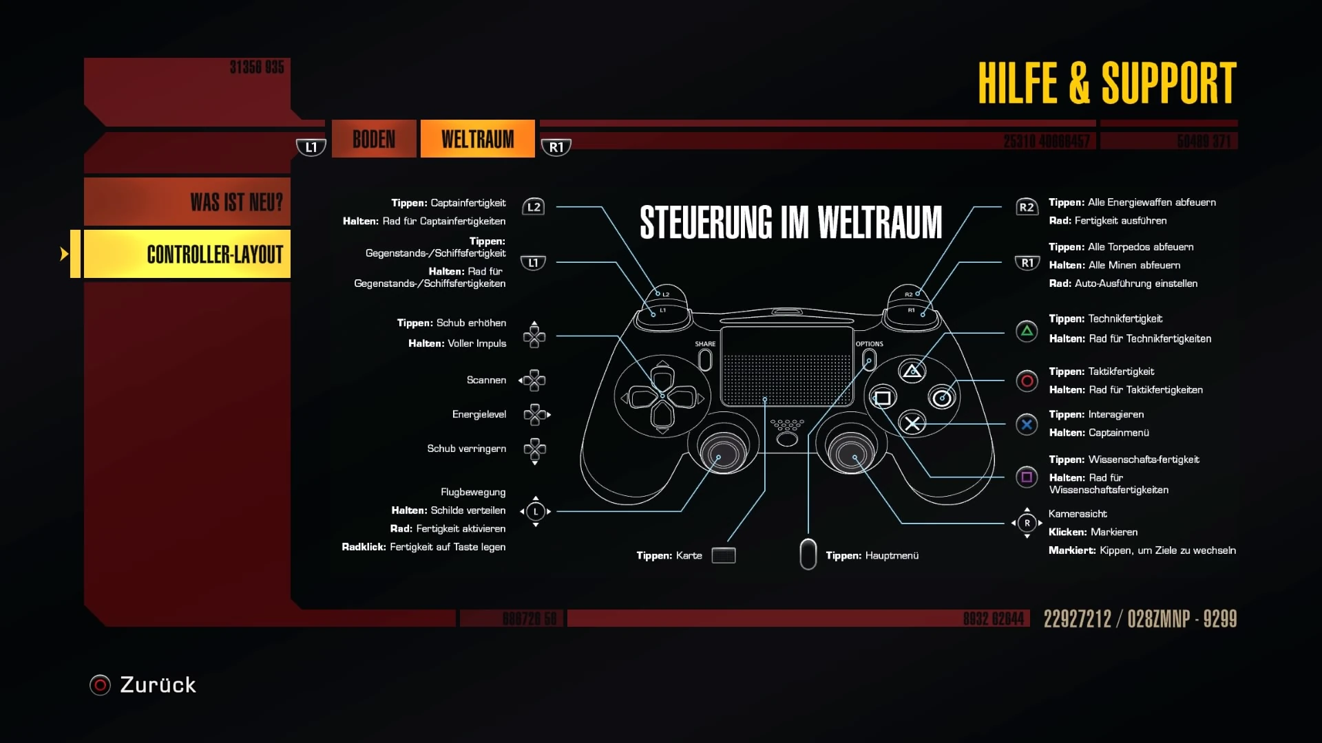 Darstellung der Ingame-Hilfe (PS4) des Controller-Layouts im Weltraum