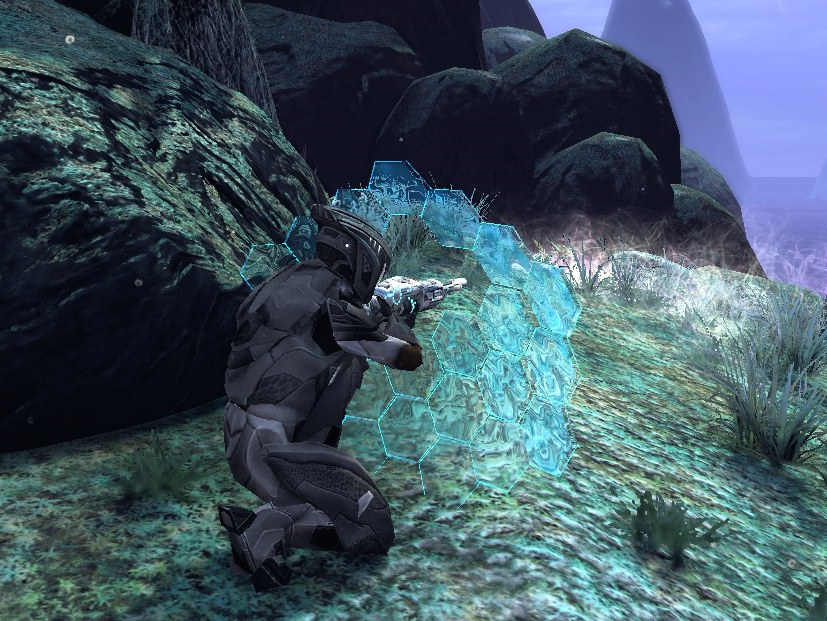 This experimental heavy combat armor provides excellent resistance to most types of damage. In addition, its features advanced sensors allowing for better detection of cloaked foes and advanced stabilizers that make the wearer resistant to knockdown. This heavy armor is also capable of activating a shield that provides a modest boost to damage resistance to non-flanking while the wearer is crouched.