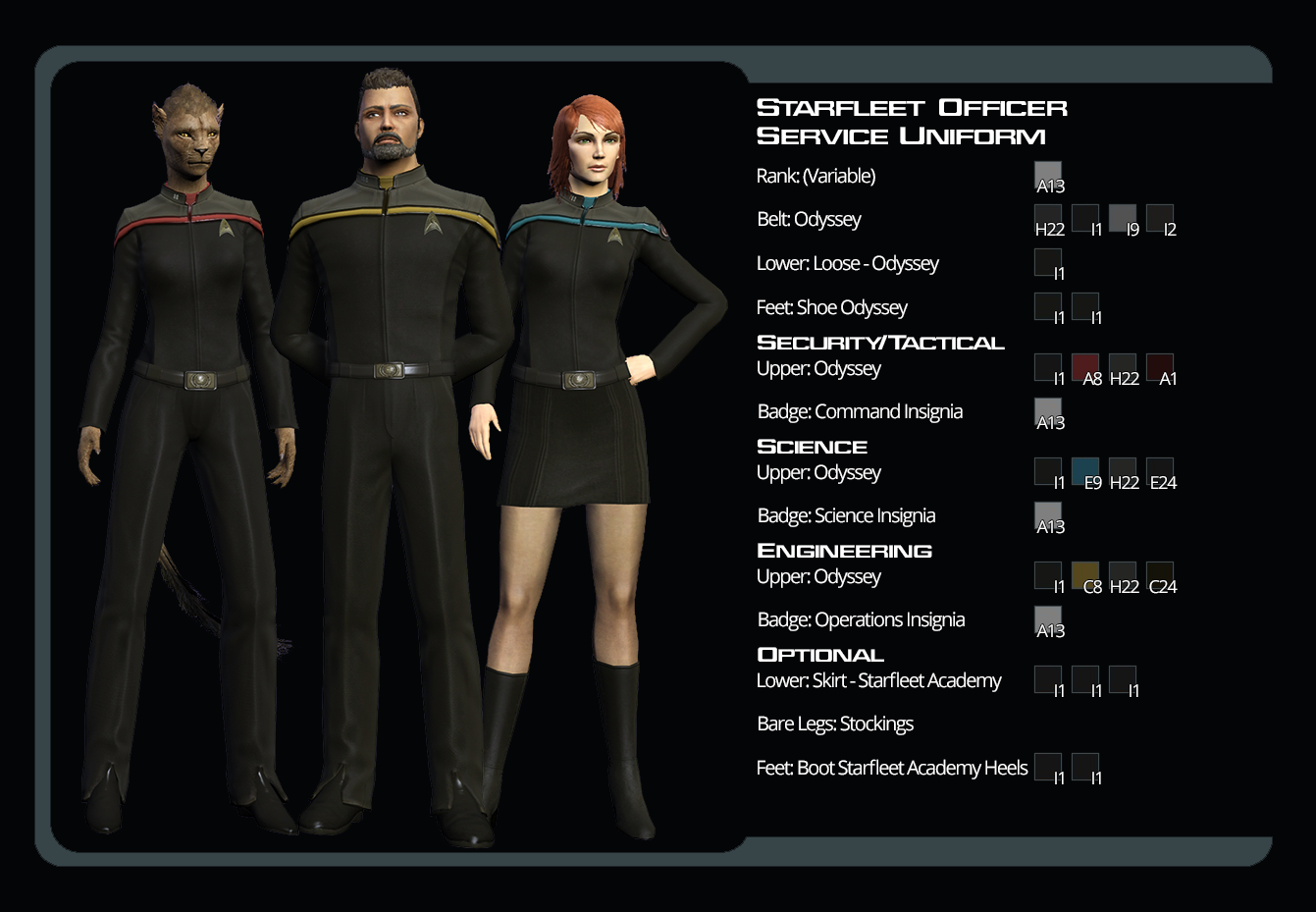 In 2410, ist die Uniform der Sternenflotte das Odyssey-Design, Captains haben allerdings erheblichen Spielraum bei den einheitlichen Regelungen für ihre Besatzung. Die Uniformen der Sternenflotte sind in der Regel farblich auf die Abteilung des Trägers abgestimmt (in Star Trek Online: Rot für Taktik, orange für Technik und blau für Wissenschaft; beachten Sie, dass dies von Kanoniales) abweicht. Der Rang wird durch eine Reihe von Kragenspitzen angezeigt (dies variiert mit der Zeitperiode).