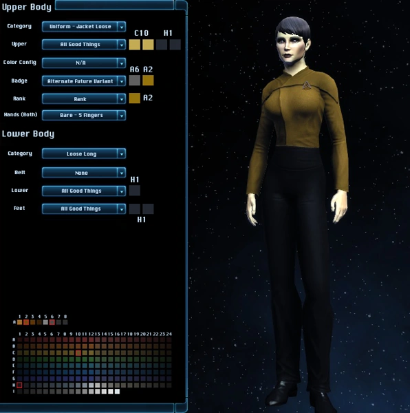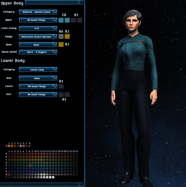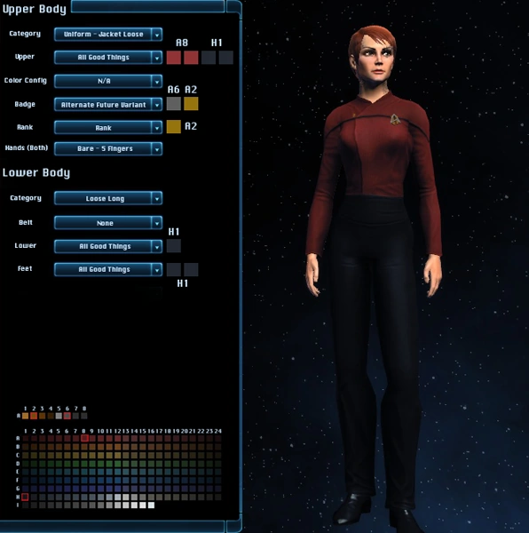 The All Good Things Uniform is a uniform used in several episodes of Star Trek: The Next Generation, Star Trek: Deep Space Nine, and Star Trek: Voyager to represent a potential future reality (in the late-24th century). It's first and most notable use was in All Good Things...