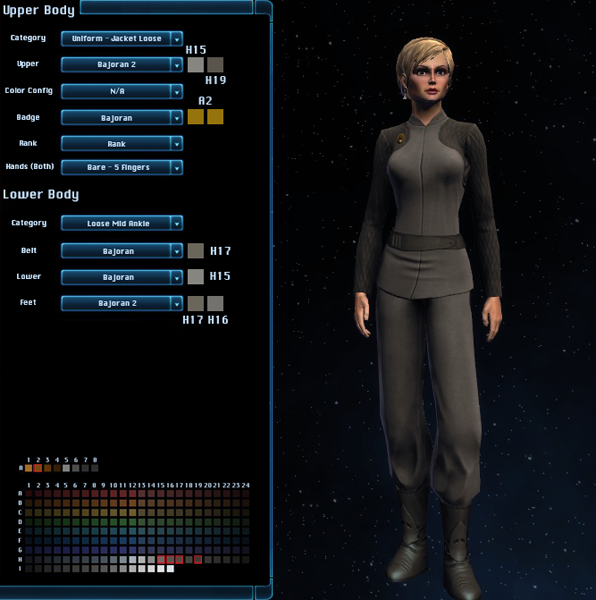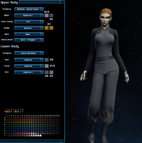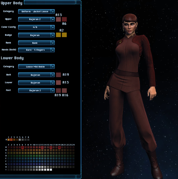 The Bajoran Militia Uniform is the outfit worn by members of the Bajoran Militia, seen in Hathon and on Deep Space 9. It is available in the Zen Store for 550