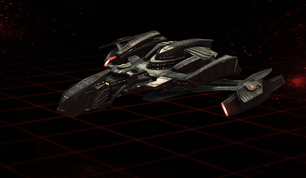 The Khnial Class is a series of powerful Tal Shiar Battle Cruisers based on the design of the D'deridex and upgraded with adapted Borg technology. By augmenting the D'deridex, the Tal Shiar designed this vessel to focus on crippling and disabling enemy ships, or even turning them against one another. Due to its advanced technology, the Khnial has access to Sensor Analysis, allowing to gradually increase its damage dealt to a single target, based on how long it keeps that target as its focus. Heavily resembling Nero's Narada from the 2009 Star Trek, the Khnial bears little, if any, resemblance to the sleek lines of Romulan Warbirds. The ship's jagged fore extrusions and angular appearance are due to incorporation of Borg technology in the ship's design.