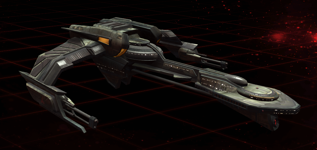 The Negh'Var class is obtained at the Brigadier General rank. It continues as its predecessors did in terms of the increased size and crew compliment. In comparison to the Rear Admiral Federation Cruisers, it has 2.5x to 3.2x the crew compliment, better turn rates and can load cannons, and has the same hull and shield strength. It is one of few vessels in the Klingon Defense Force that has eight weapon slots. It was first known to the Federation in 2372 during a skirmish with Deep Space 9. The Negh'var is an imposing vessel with broad, fixed wings carrying twin warp nacelles. Similar to the Vor'cha class, the Negh'Var has a large forked forward section and weapons array.