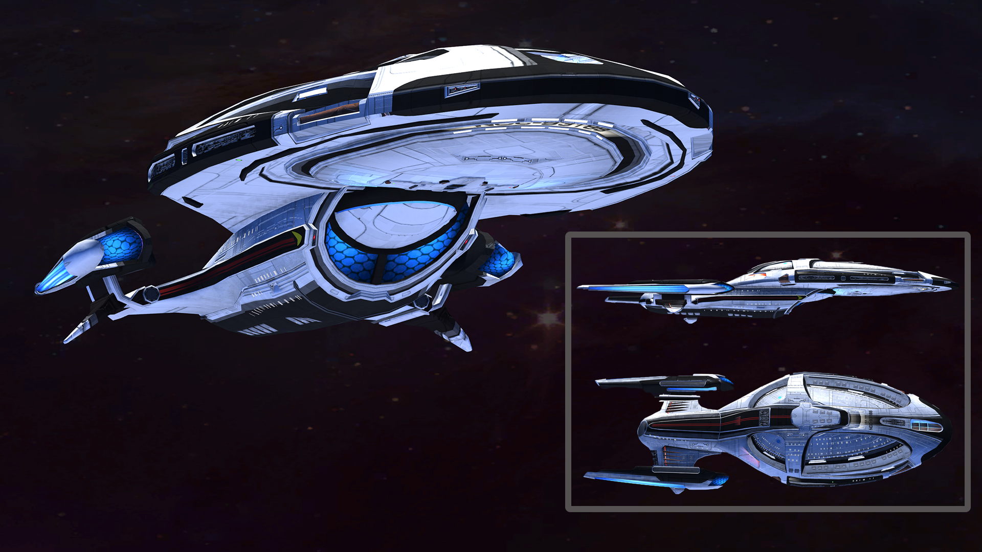 | SKIN UNLOCK: Free After creating the successful Intrepid class, the Utopia Planitia designers decided to update the design. Thus in the year 2400, Discovery was born. It was designed to be just as capable as Cochrane and Intrepid and even more advanced. A brand new nacelle design and highly experimental pylon fins were aimed at creating a more efficient and stable flight during warp travel when nacelles were in the upward position. | |