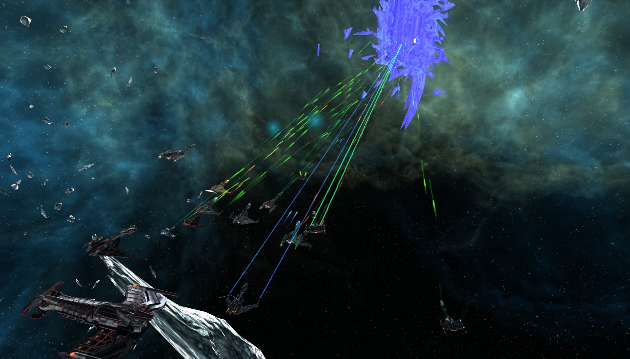 All ships are in a tight formation aiming at the Crystalline Entity. Maintaining a distance of 7-9 km, they alternate using two versions of Cannon: Scatter Volley to deal damage to the Entity and kill all fragments that spawn from it. Apparently, by concentrating a tremendous amount of area-of-effect fire around the Entity, most Small Fragments will be destroyed before they heal the Entity. This method is really limited to attack groups made up solely of escorts or very heavy DPS ships. It is also best for all ships to come equipped with tractor beam repulsors to help keep fragments away from the group.