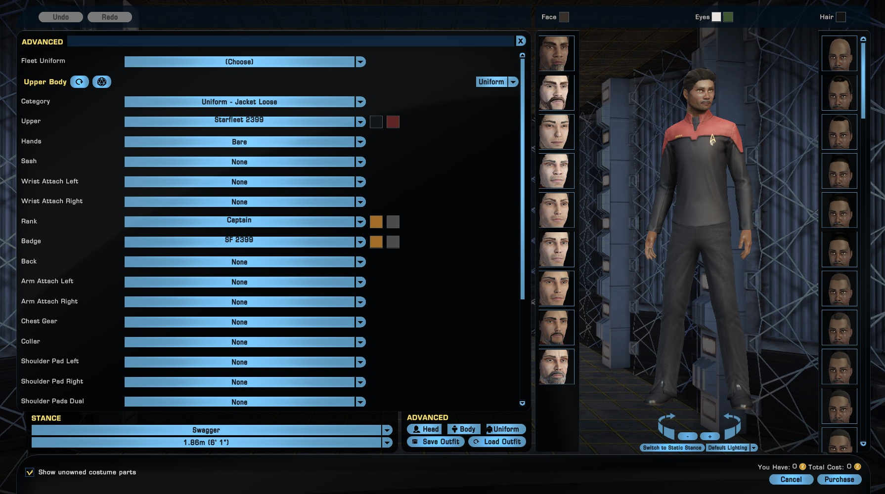 A wide selection of uniforms and outfits are available for free and from missions while many more can be purchased from the Zen Store, Lobi Crystal Consortium, Fleet holdings and event stores. These range from most canon uniforms throughout the show's history (from movie-era Excursion Jacket to Mudd's Discovery attire) to casual off duty attire such as swimwear.