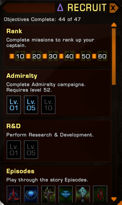 - Complete all missions in all story arcs from "From the Ashes" through "Iconian War". There will be 12 story arcs for Romulan Delta Recruits, meaning the half way point is after 6 story arcs ("Freedom").
