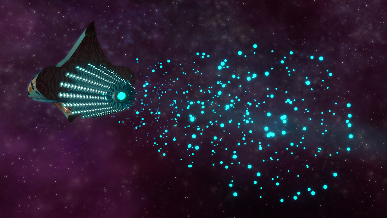 SKIN UNLOCK: Dewan Dynnasia Pilot Escort, 3,000 Streamlined look and fin-like structures protruding from the main hull of the Dynnasia class and its sister classes remind of aquatic creatures from Earth. Exotic brushlike propulsion system on the ship's aft consists of a large number of smaller exhaust plumes. |