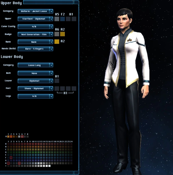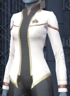 The Starfleet - Diplomat uniform is an outfit available to Star Trek Online players who have achieved the diplomatic rank of Ambassador. It is based on the dress uniform seen in Star Trek: Insurrection and Star Trek: Deep Space Nine. It includes a top, trousers and shoes.