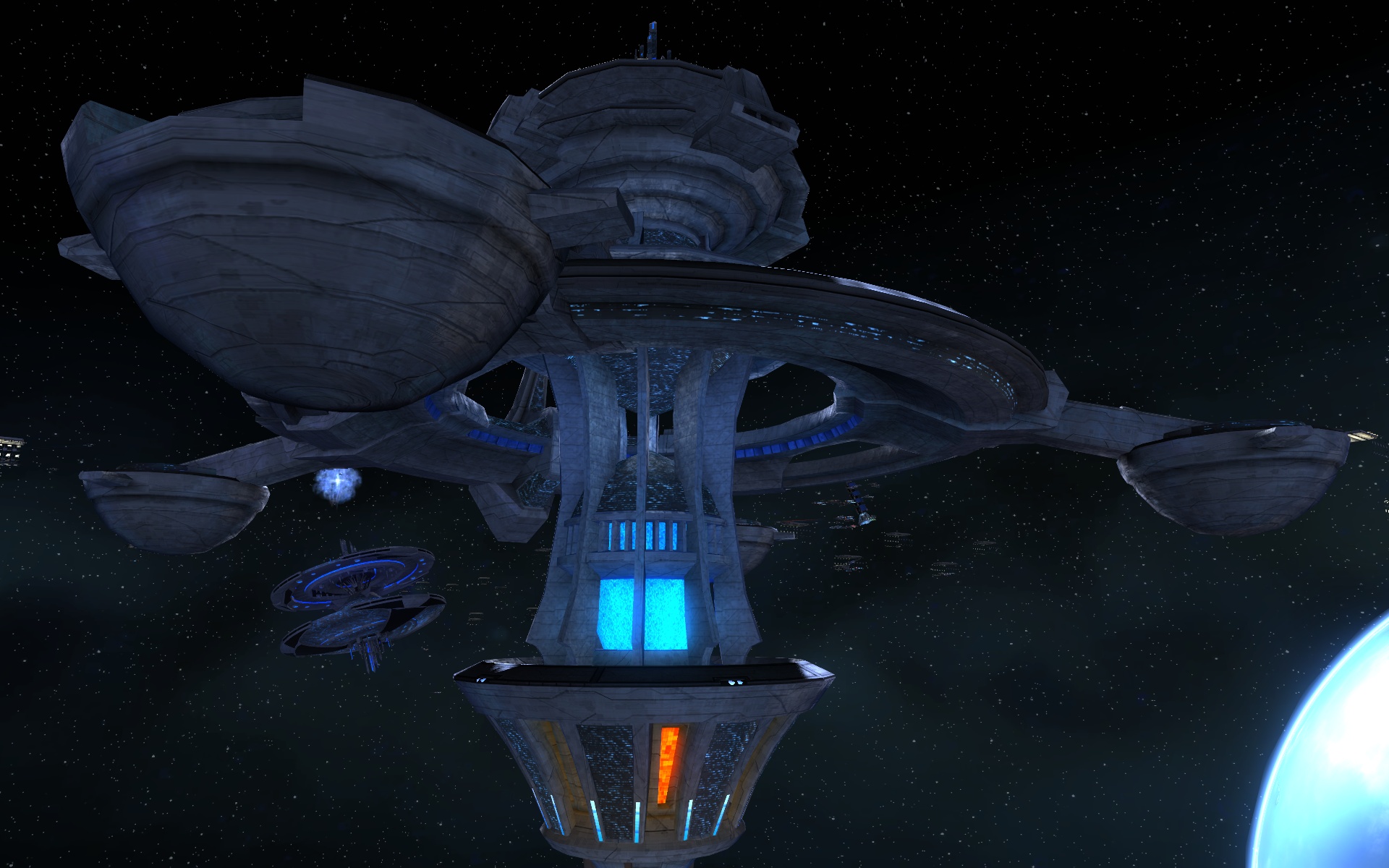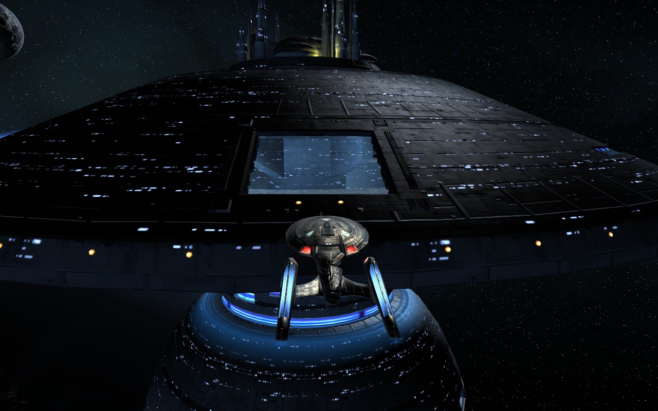 Earth Spacedock is a facility orbiting Earth in the Sol System, and serves as the main hub for all Federation players. Although Earth spacedock was constructed sometime prior to 2285, its nine accessible main sections are outfitted with state-of-the-art technology.