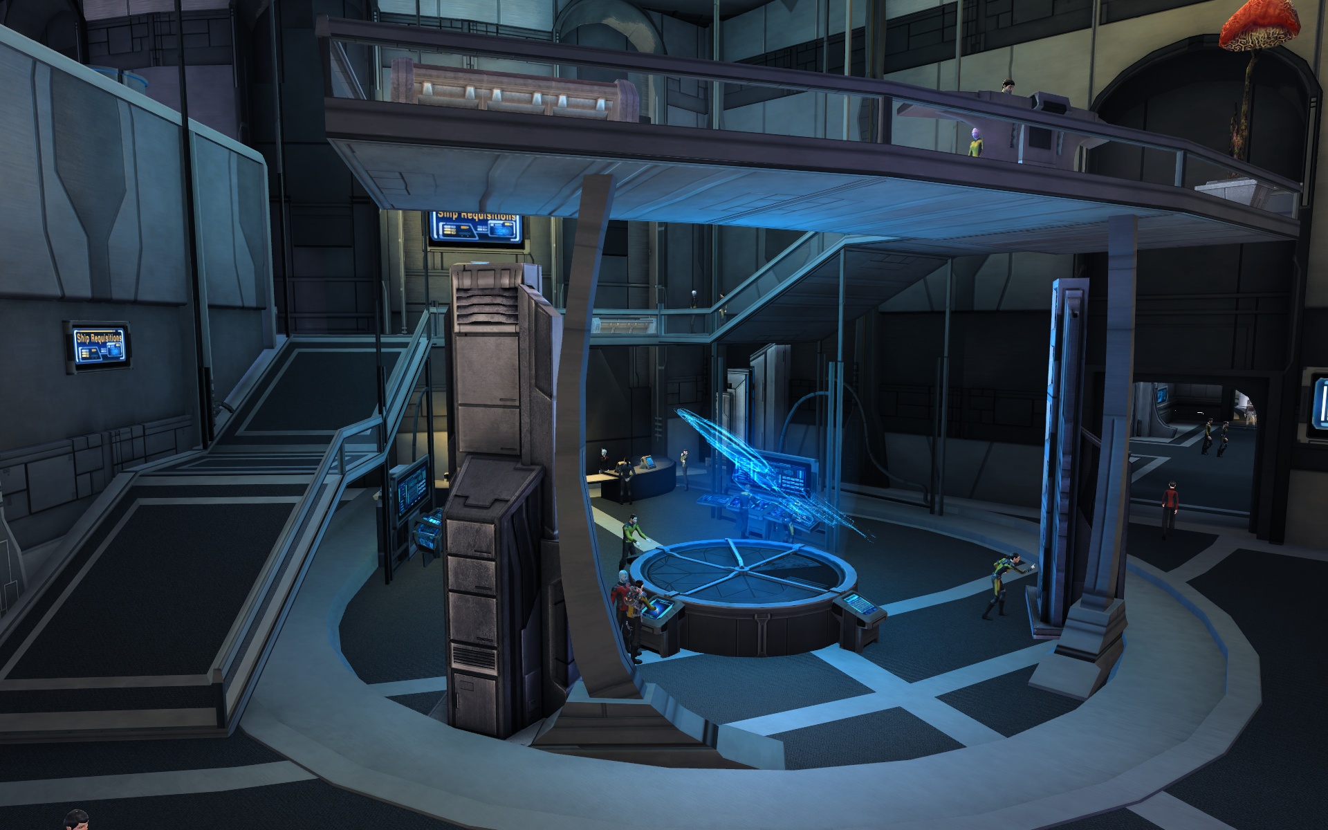At the Shipyard, players can talk to select and customize their starship, and a turbolift to Starship Requistions allows new ships to be obtained.