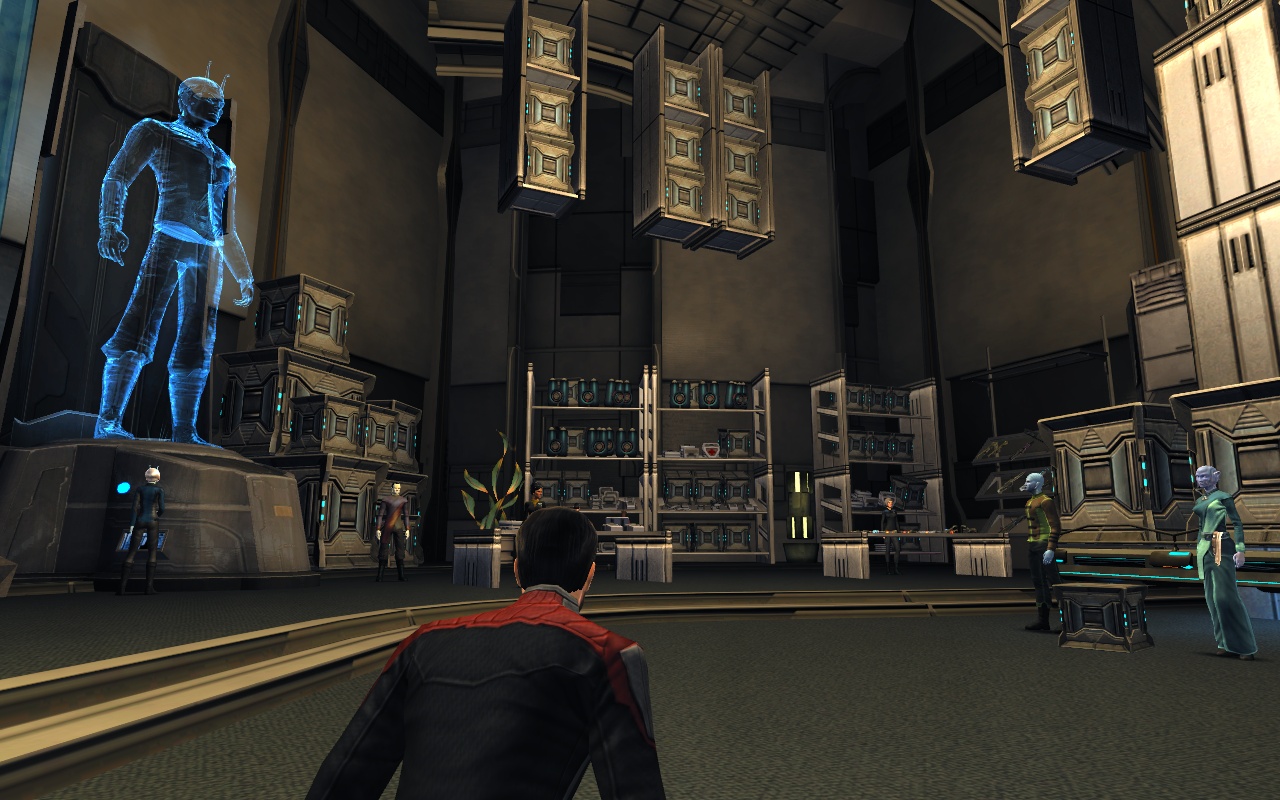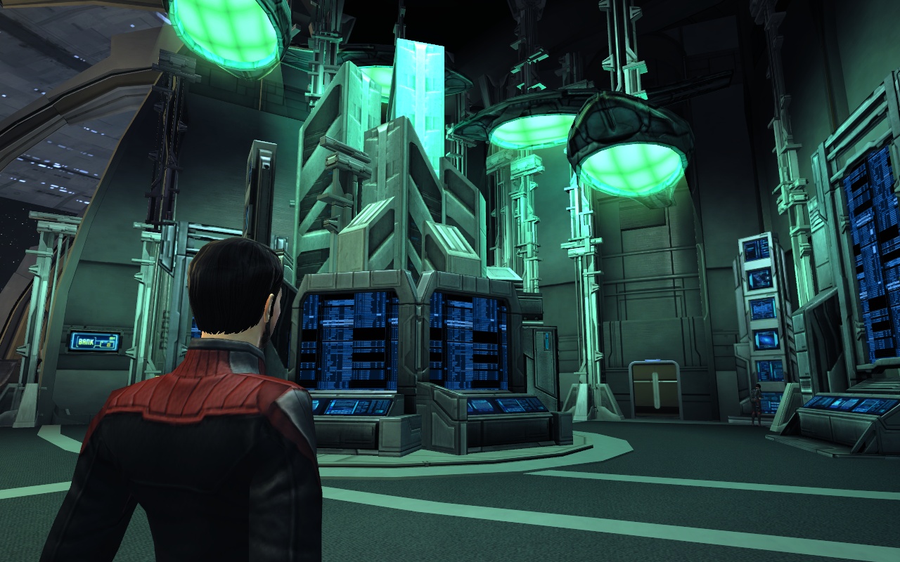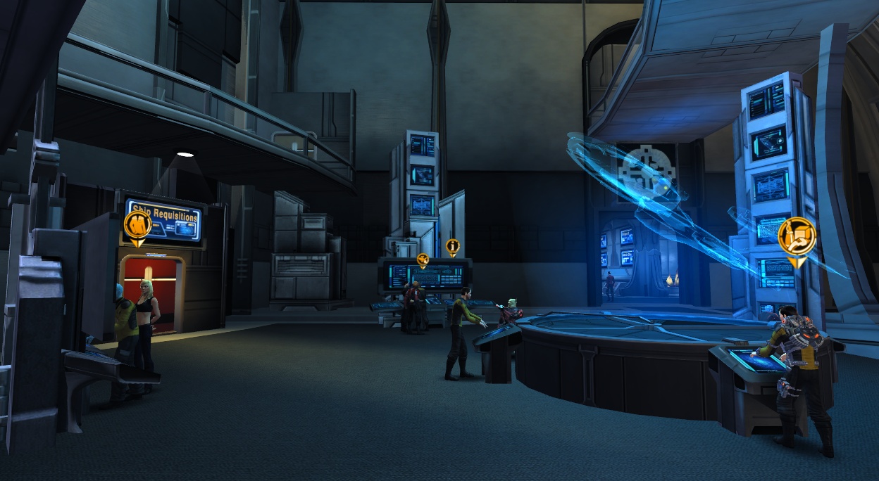 Here players will find the bank, their fleet bank, and the Exchange, where players purchase and sell items with other players. Next to the bank consoles there are Mail consoles which allow to send items to other characters.