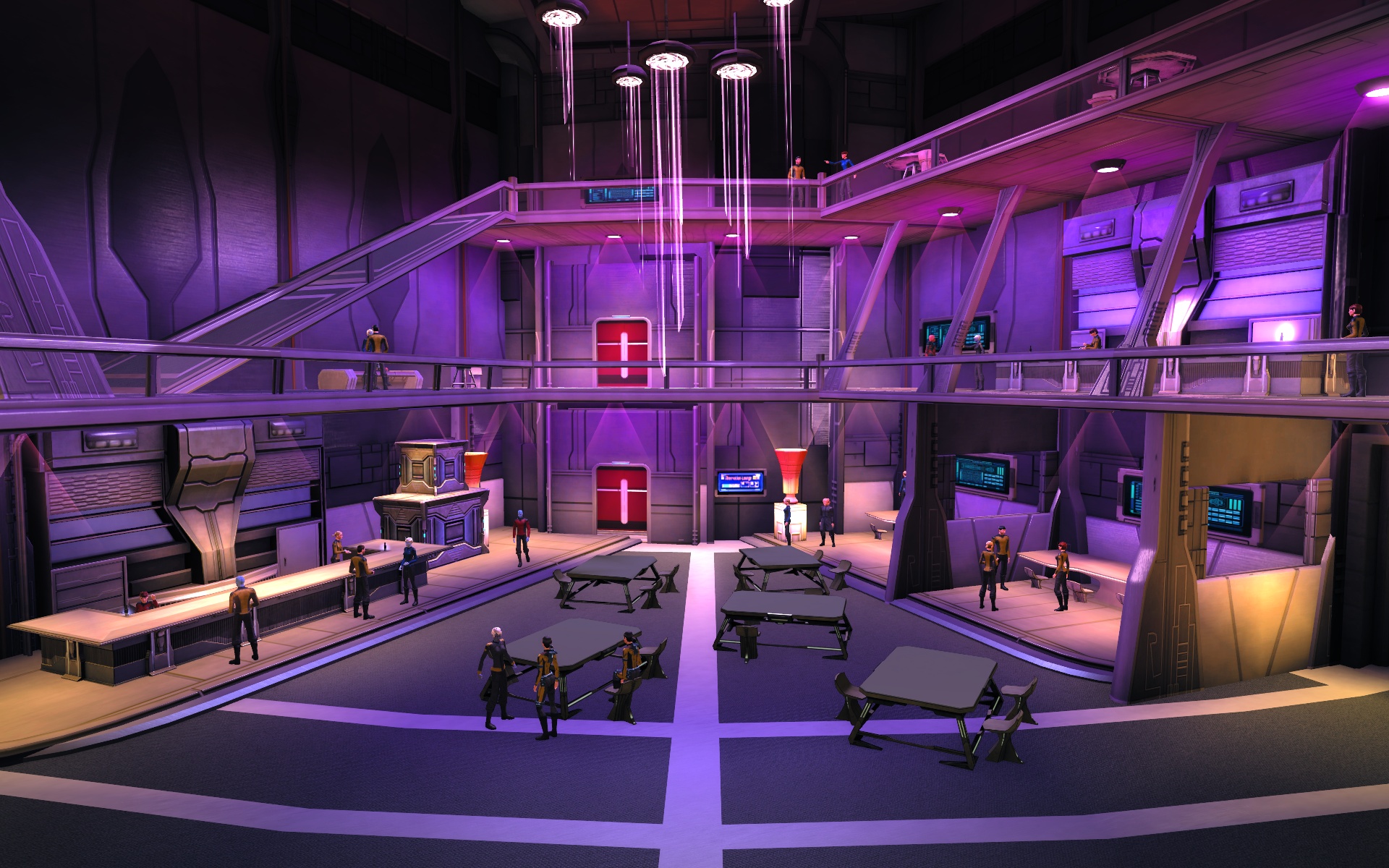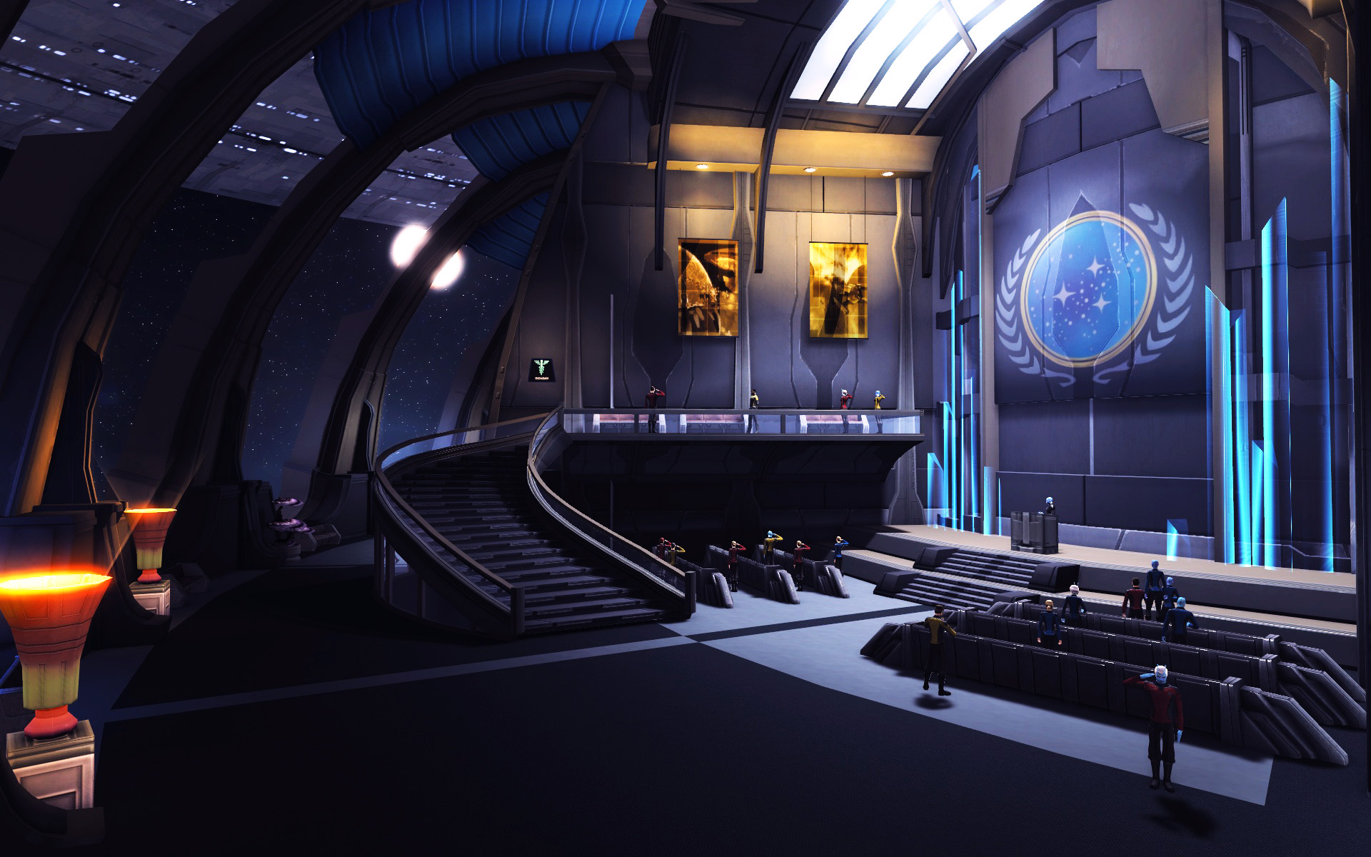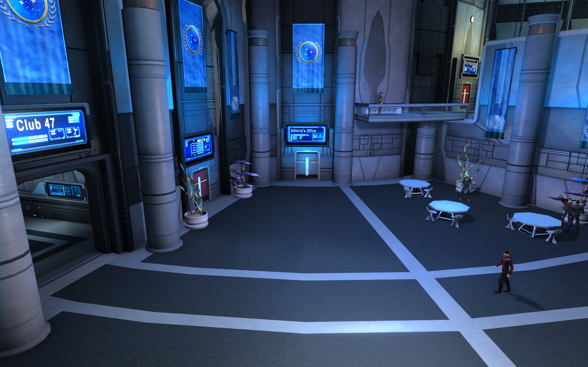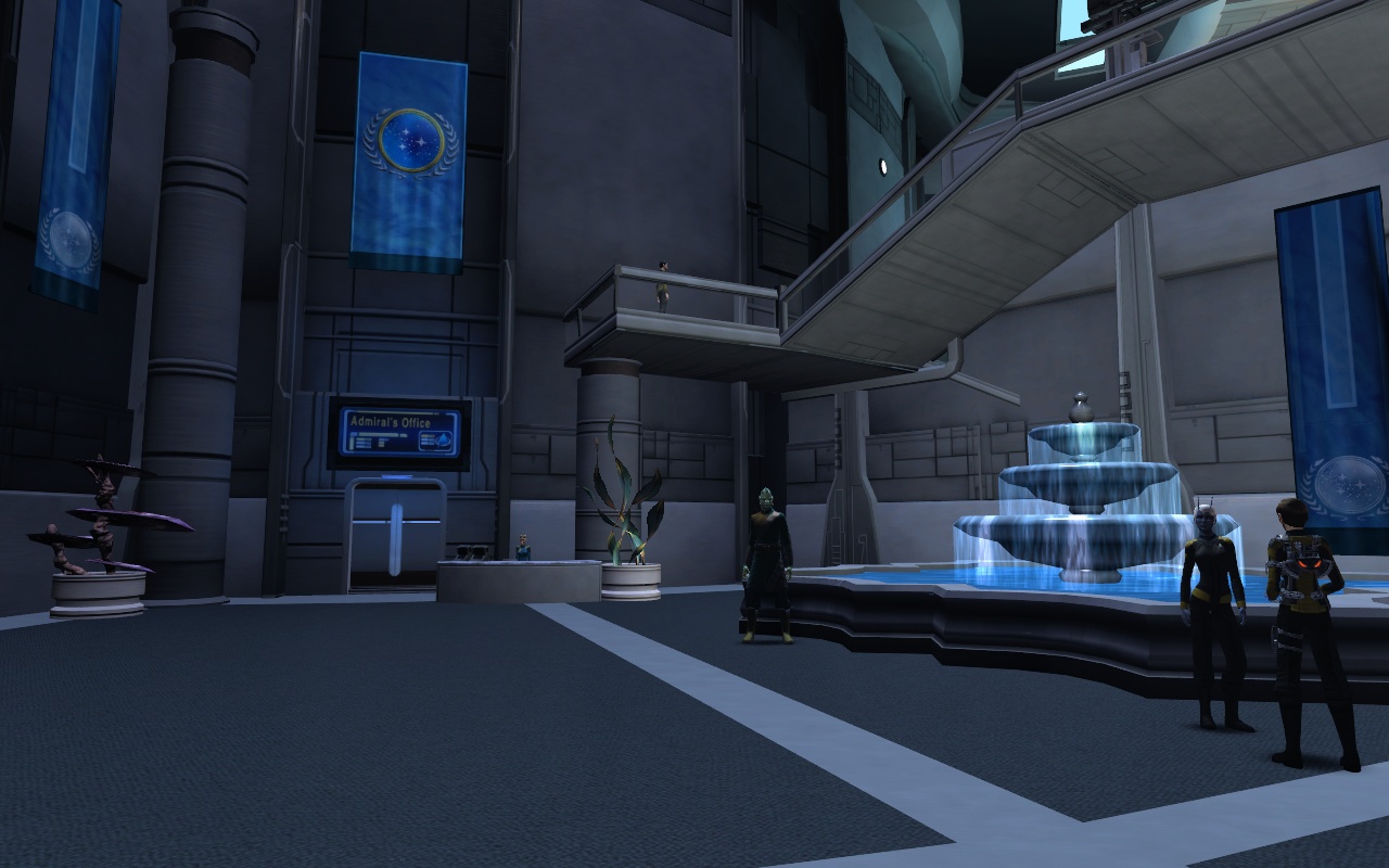 - Starfleet Liasion stands on the lower mezzanine looking out onto the lobby.