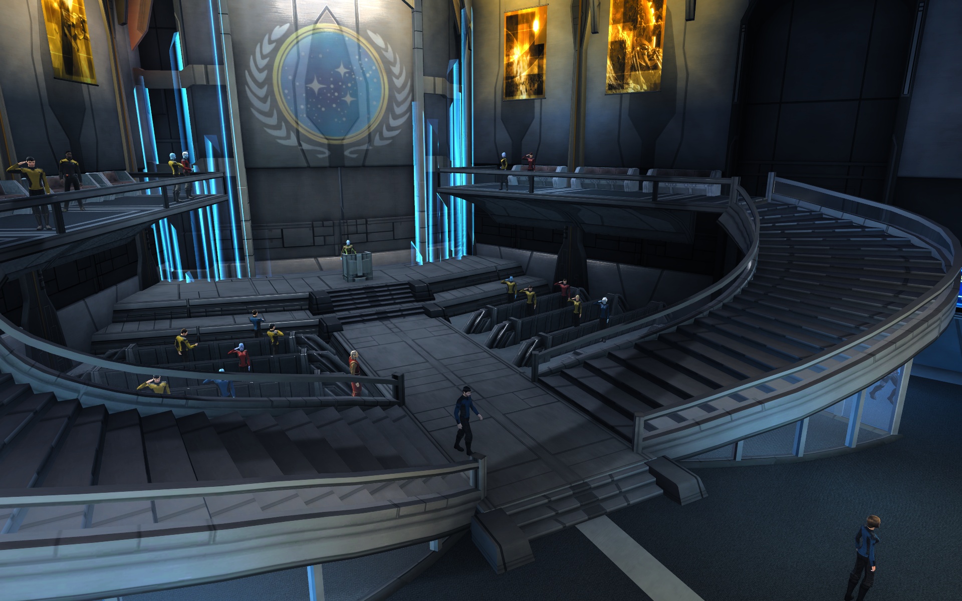 This is the conference hall where several nameless NPCs brag about random players and watch on as an officer speaks about advances in astrophysics.