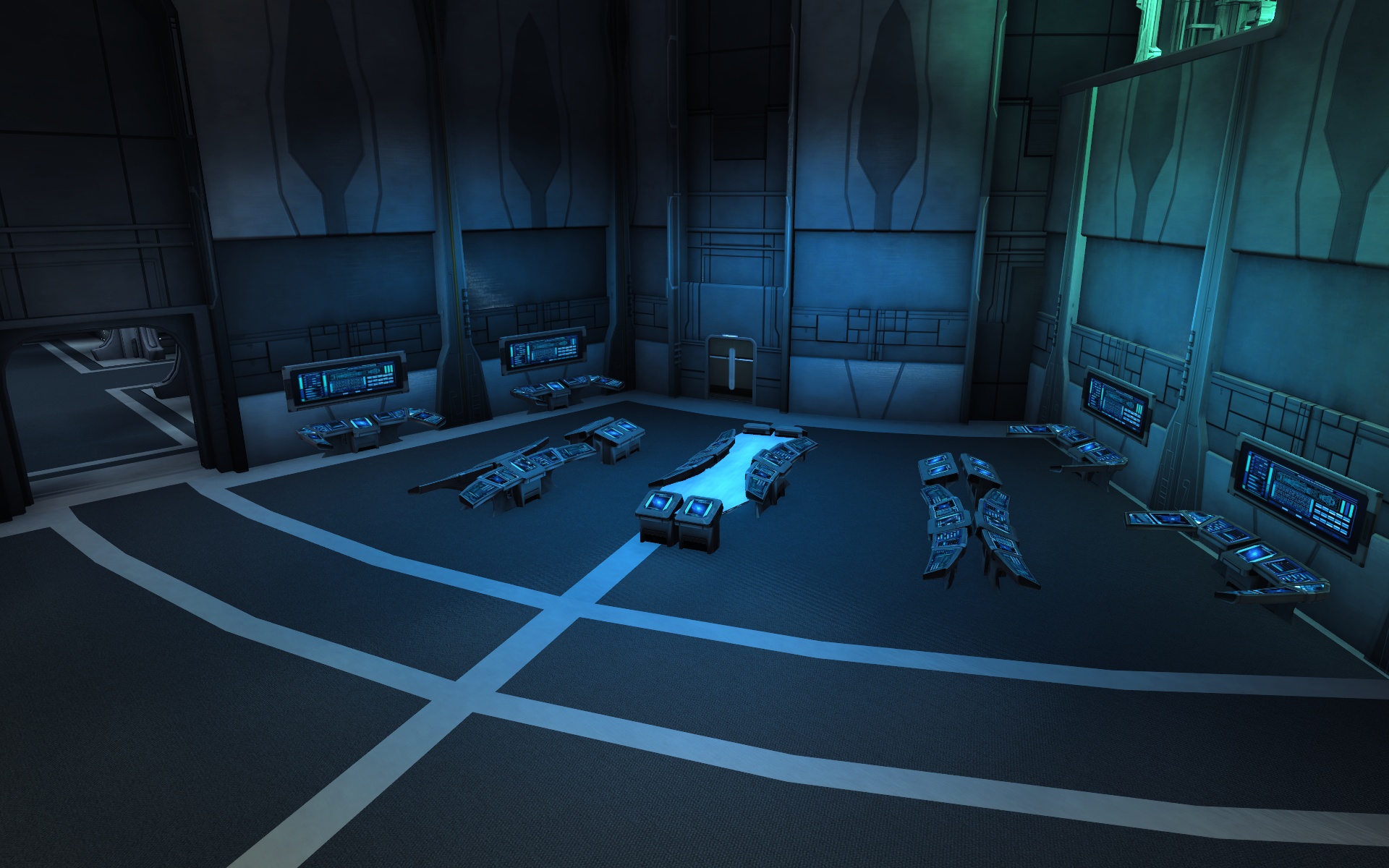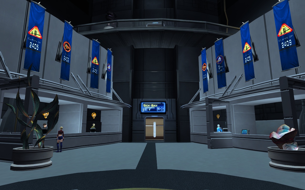 In this section of Spacedock, players can requisition bridge officers and start and manage their own fleets. Through the door is the sickbay.