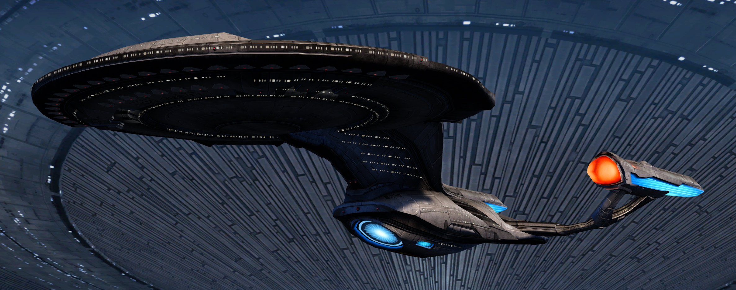 SKIN UNLOCK: Free ![]() Starfleet's top-of-the-line vessel in the mid-24th century, the most prominent Exploration Cruiser variant is the Galaxy class, which was the flagship of the fleet when it was first introduced in the late 2350s. The most well known Galaxy-class vessel was the USS Enterprise-D, commanded by Captain Jean-Luc Picard. This is the shortest Exploration Cruiser variant, but the best known. On T5 and T6 variants, players may also select the "Galaxy Refit" nacelles, which have phaser strips on the dorsal side like on the Galaxy Dreadnought Cruiser and the first appearance of the U.S.S. Venture. | ||||