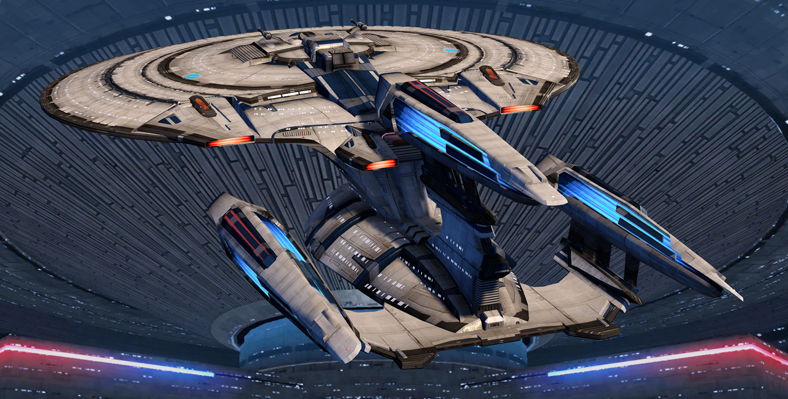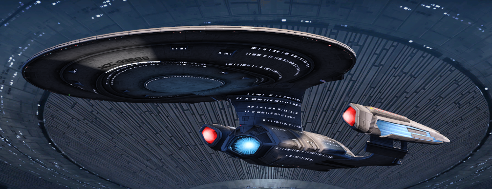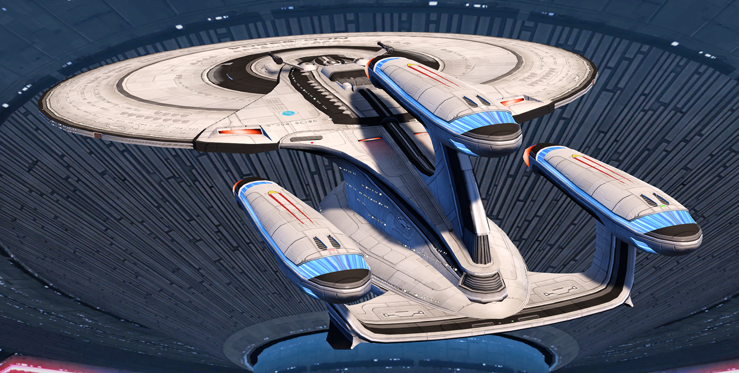 SKIN UNLOCK: Free, but only available on T4 variants The Envoy variant is the longest of the three. The saucer and and neck are also the largest. The pylons are slightly banked and are forked toward the nacelle area. The ship is significantly bulkier than the other variants which feature smooth hulls. Its nacelles are less armored than the others with a field grille covering the bottom end of the nacelle. | ||||