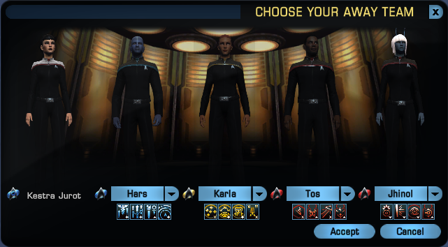 Some missions within the game are classified as "solo content". These one-person away team missions prohibit teaming and bridge officers do not accompany their captain. “Temporal Ambassador” and “Sphere of Influence” are both examples of one-person away team missions.