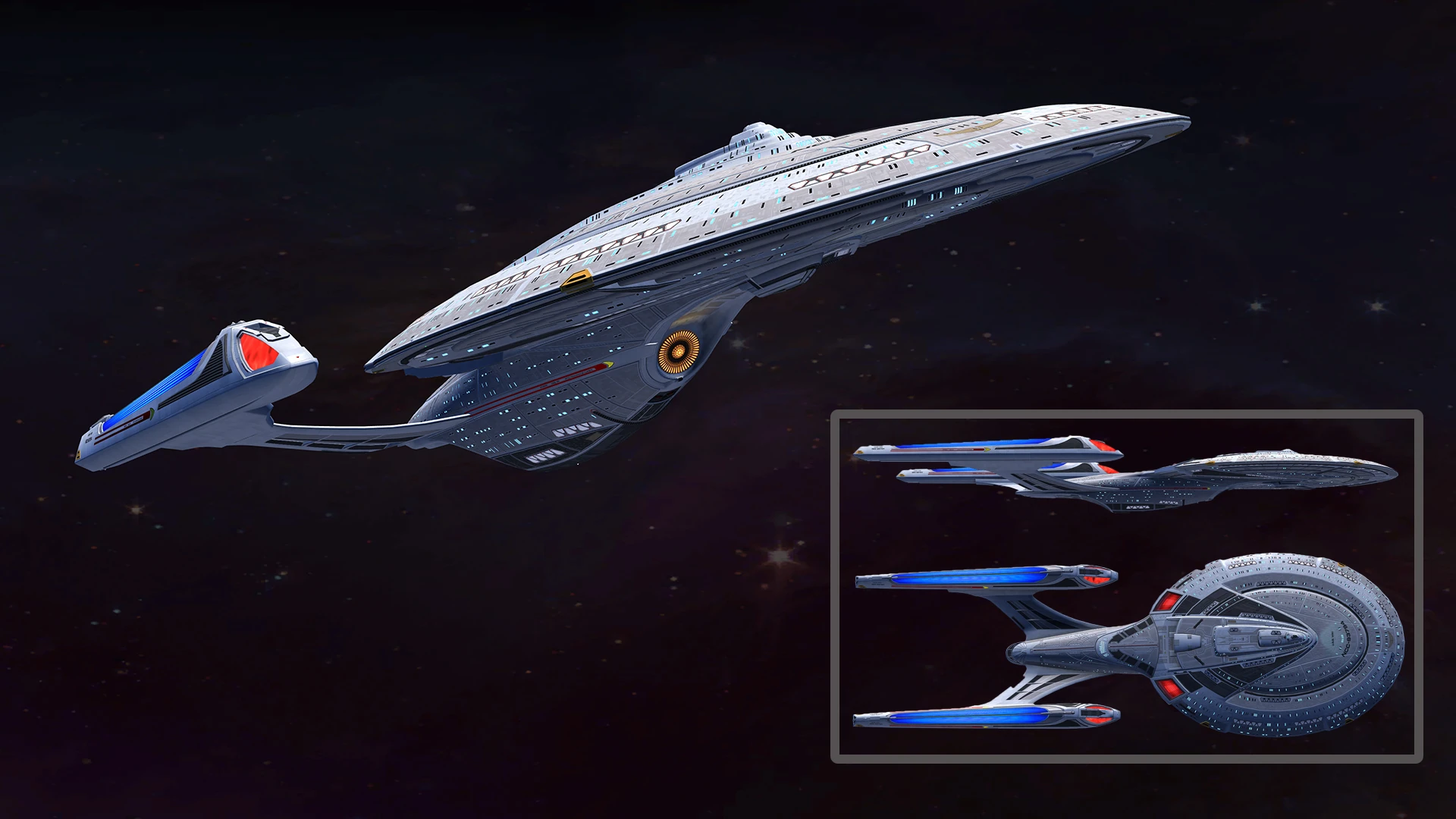 SKIN UNLOCK: Free This model is similar in design to the Sovereign. It has a bigger and more circular saucer section of the hull. The main hull is smaller than both the Majestic and Sovereign. It also has two up-swept pylons connecting the nacelles at roughly a 45 degree angle. Both the saucer and main hull are quite rugged in design compared to the other two types. |