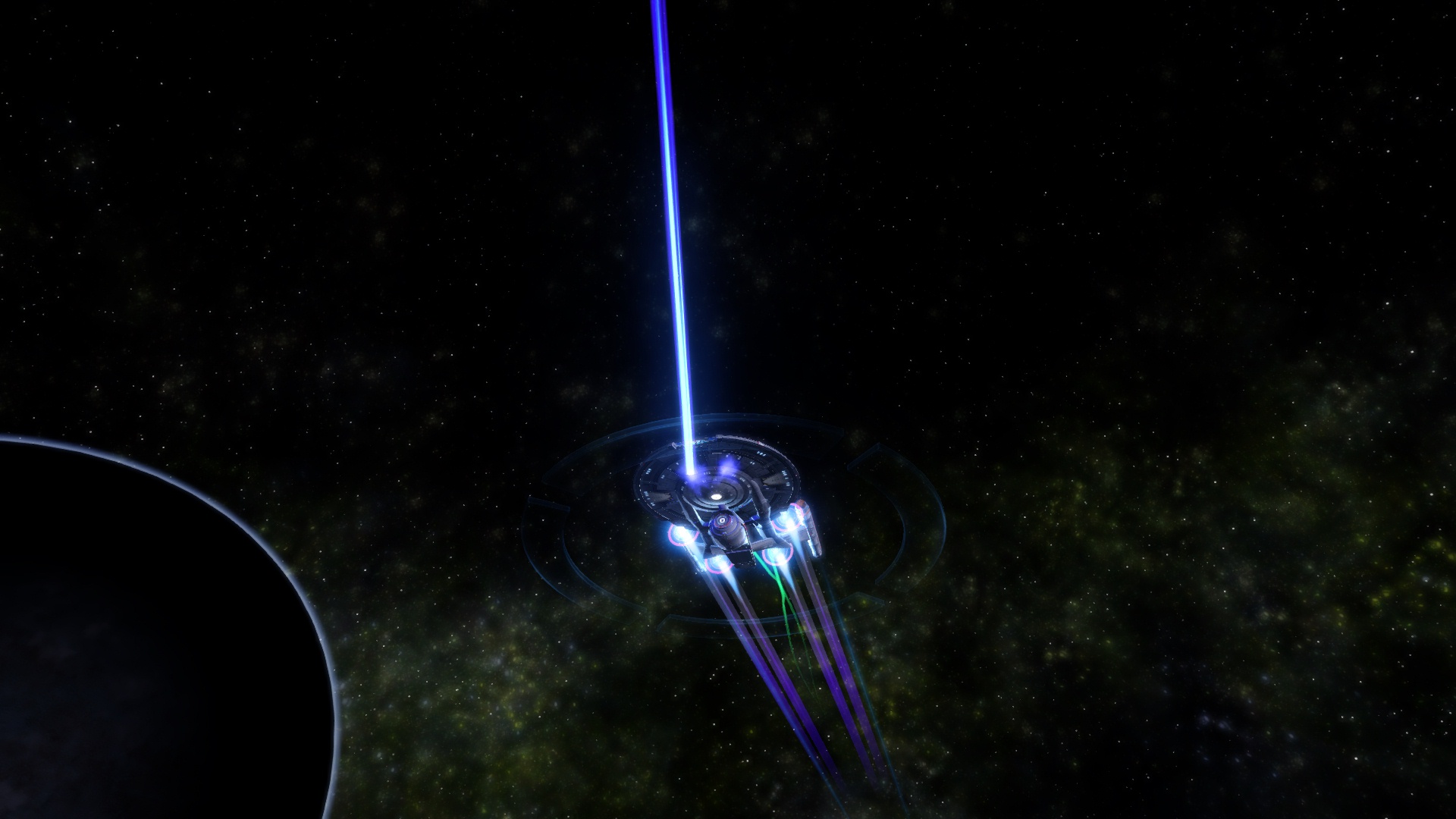 A Buran Command Dreadnought Cruiser firing a single Dark Matter-laced Quantum Torpedo