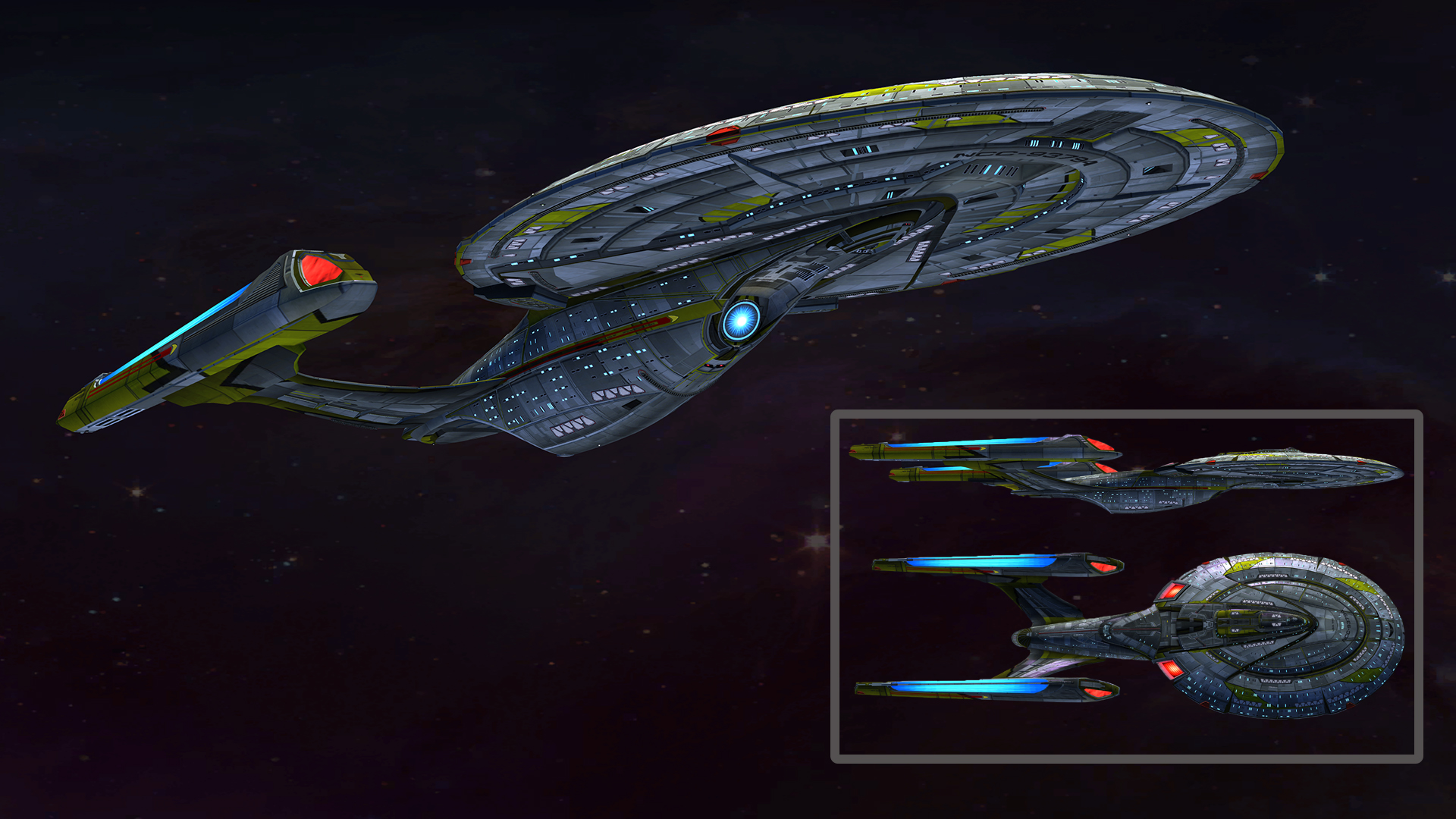 SKIN UNLOCK: Free This model is similar in design to the Sovereign. It has a bigger and more circular saucer section of the hull. The main hull is smaller than both the Majestic and Sovereign. It also has two up-swept pylons connecting the nacelles at roughly a 45 degree angle. Both the saucer and main hull are quite rugged in design compared to the other two types. |