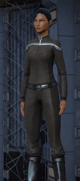 Admiral Zelle wears the "Excursion" variant of the Odyssey uniform; however, it features gold piping, rank pips, and combadge, similar to the "Admirals and Fleet Admirals" version of the Flag Officer Service Uniform.