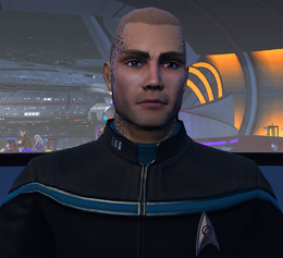 Lieutenant Commander Orjas is a Trill Starfleet Science officer sitting at the bar of Earth Spacedock's Club 47.