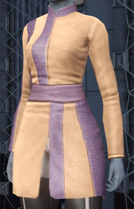 The Robe Vertical Panel is one of the civilian-look Starfleet outfits available to all players on the character's creation. It is available under Off-Duty Robes and hence cannot be worn by bridge officers.