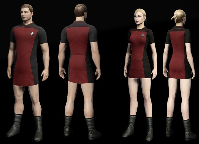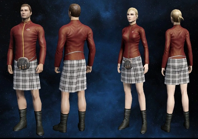 The Skant Uniforms and Kilt Uniform were available as a timed giveaway. The Starfleet scant (infobox image) is designed as it appeared on some male crew on Star Trek: The Next Generation and comes with a matching top. The Klingon and Romulan variants (see gallery below) are simply the lower piece. The Kilt is based on Montgomery Scott's dress outfit from Star Trek: The Original Series. All skants are available for female as well as male characters.