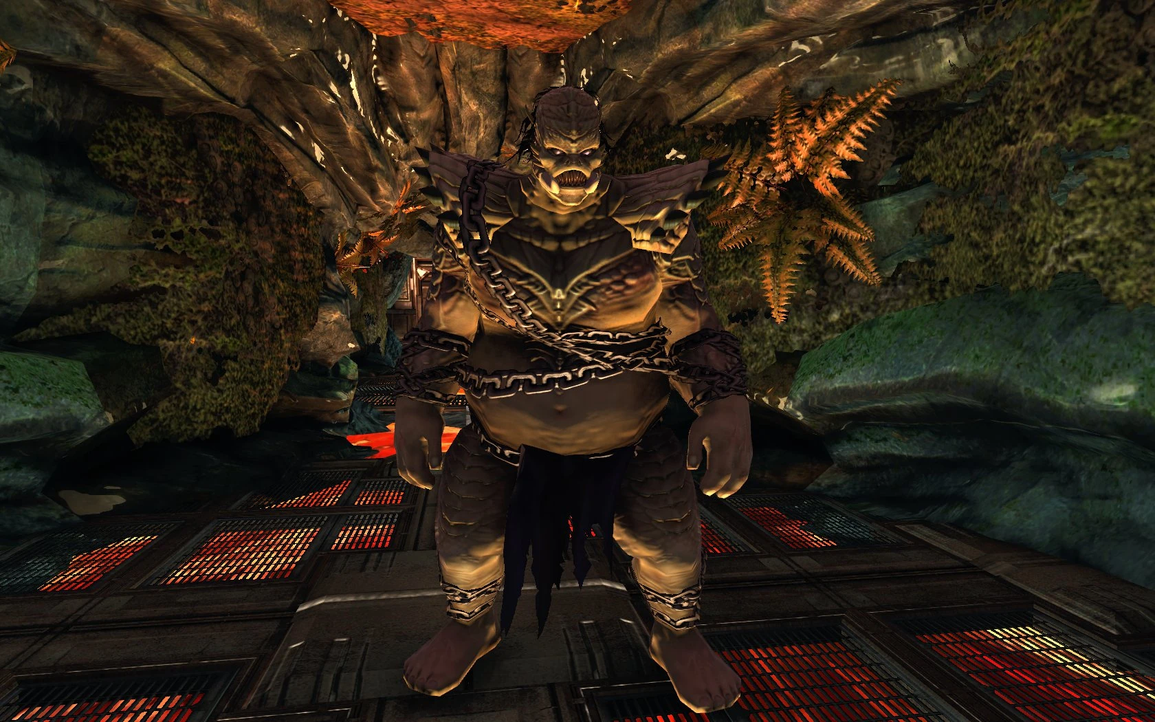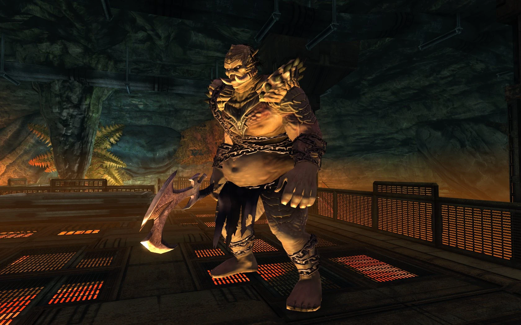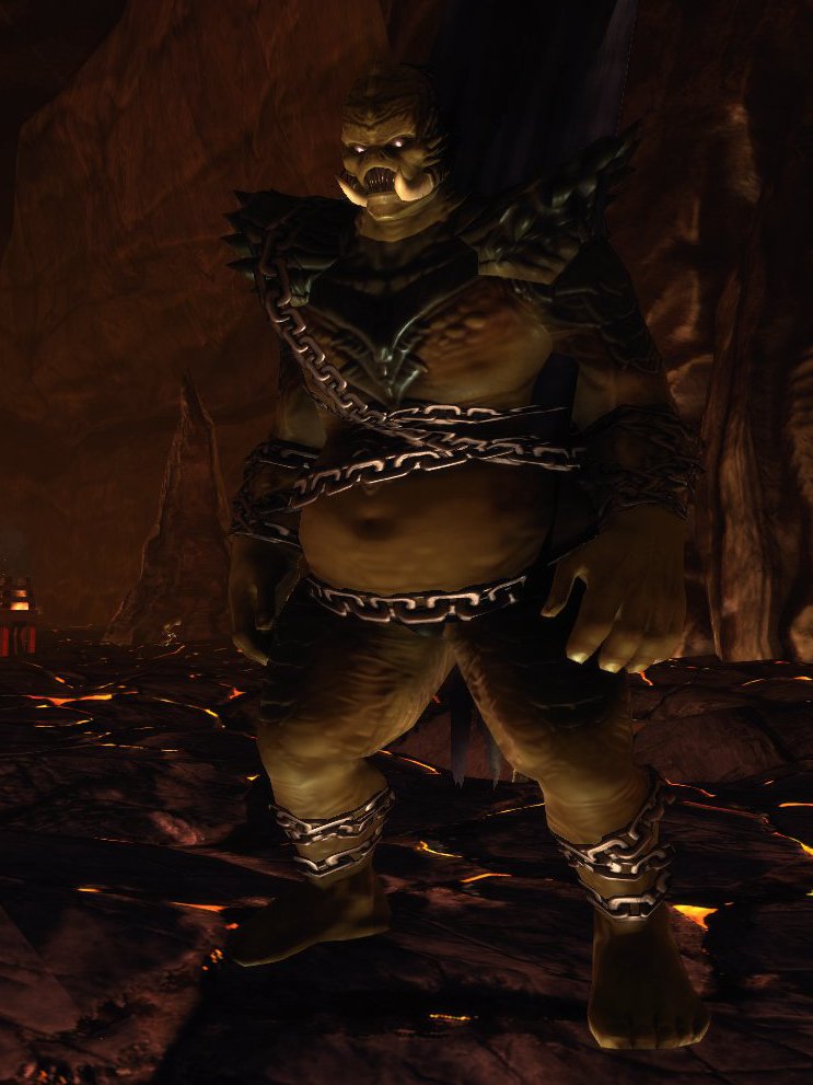 Slave Masters are brutish Fek'Ihri warriors that form part of the Fek'Ihri Horde. They resemble huge, horned, beast-like Klingon warriors wrapped in chain. Slave Masters carry a large sickle and have a long reach, though they move slowly.