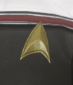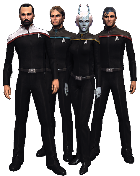 In 2410, Starfleet's uniform is the Odyssey design, although captain's have considerable leeway in the uniform regulations for their crew. Starfleet uniforms are typically color coded to the wearer's division (in Star Trek Online: red for tactical, yellow for engineering and blue for science; note that this deviates from canon) while rank is indicated by a series of collar pips (this varies by time period).