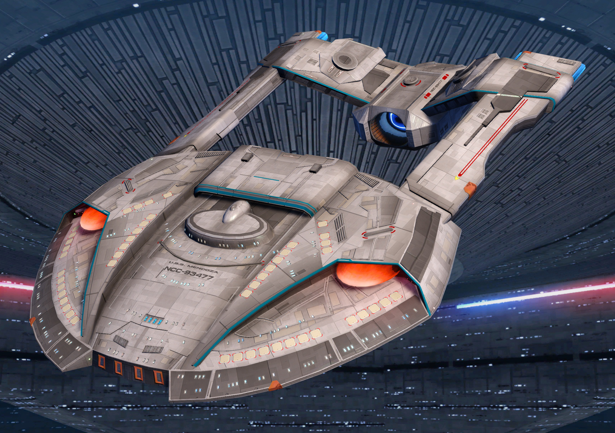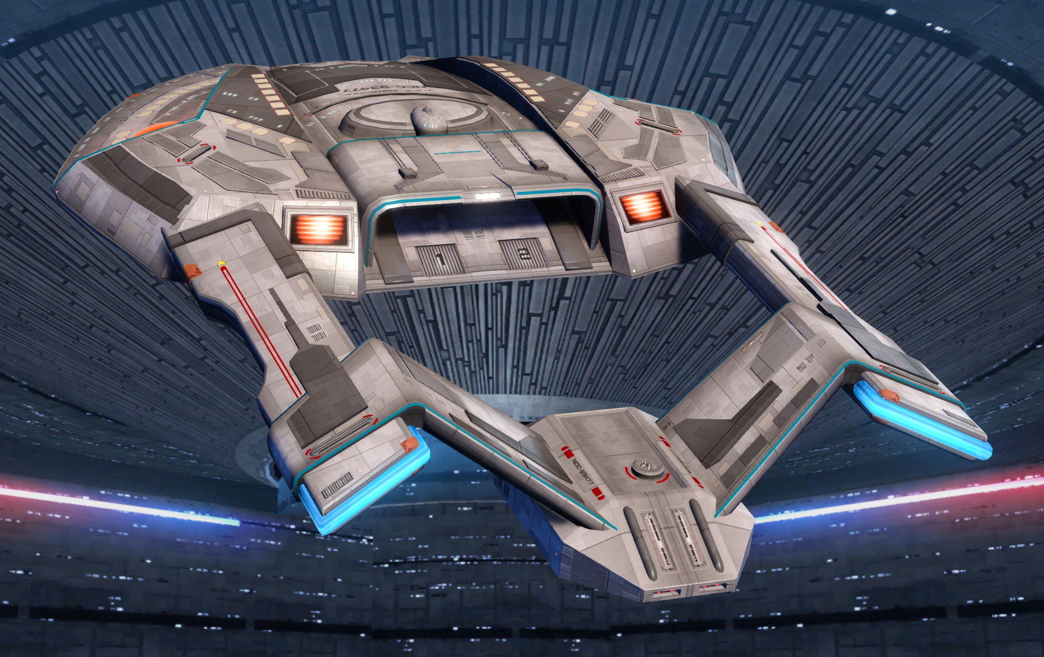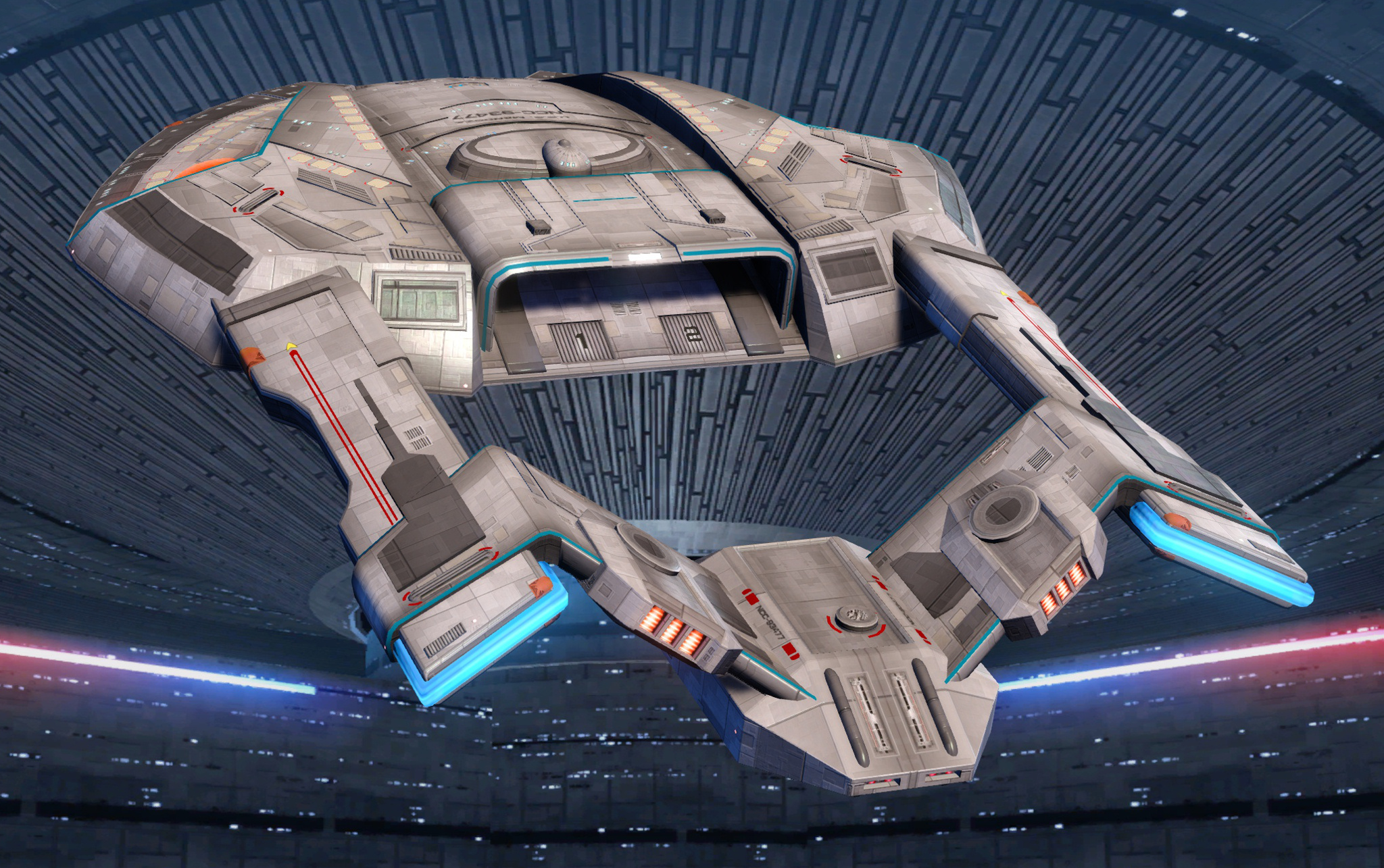 SKIN UNLOCK: Free The Steamrunner-class starship's design serves as the basis for the 25th-century Zephyr-class Heavy Escort, and pioneered many of the Zephyr's signature design features. These include unusual catamaran nacelles that are mounted directly onto the saucer section and a trailing secondary hull, suspended between the nacelles. Thus the Steamrunner's nacelles effectively double as the pylons connecting the saucer and secondary hull. Unlike the Zephyr class, though, the Steamrunner's deflector is not mounted on the saucer but on the trailing secondary hull, akin to the mission/weapons pod on an Akira-class ship. Like the NX-class escort, the secondary hull hangs below the saucer, with the connecting struts angling down. The saucer itself resembles an upside-down spade blade, sloping downward from the nacelles. |
