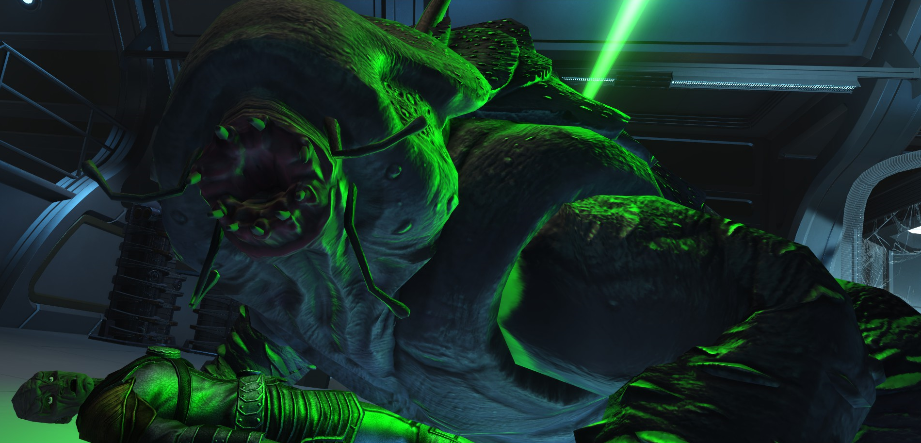 “Secrets”: During a firefight in the Glenn's Engineering Lab, the Tardigrade breaks loose and attacks several Klingons. It is later beamed to containment when it attacks the player.