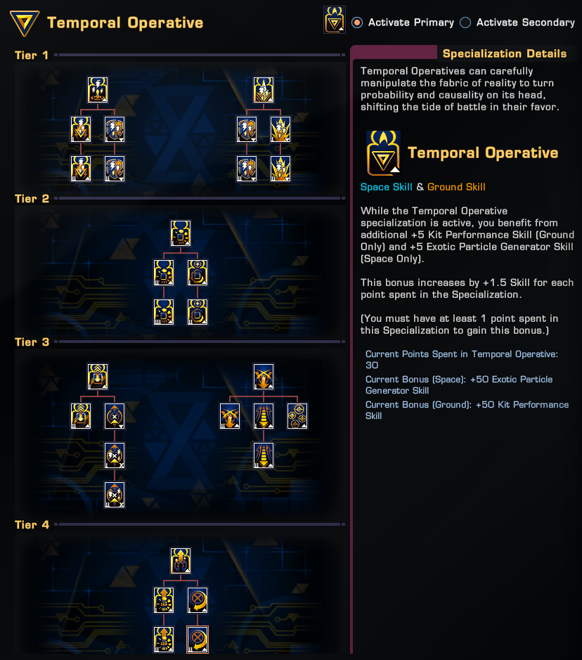 While the Temporal Operative specialization is active, you benefit from additional +5 Kit Performance Skill (Ground Only) and +5 Exotic Particle Generator Skill (Space Only).