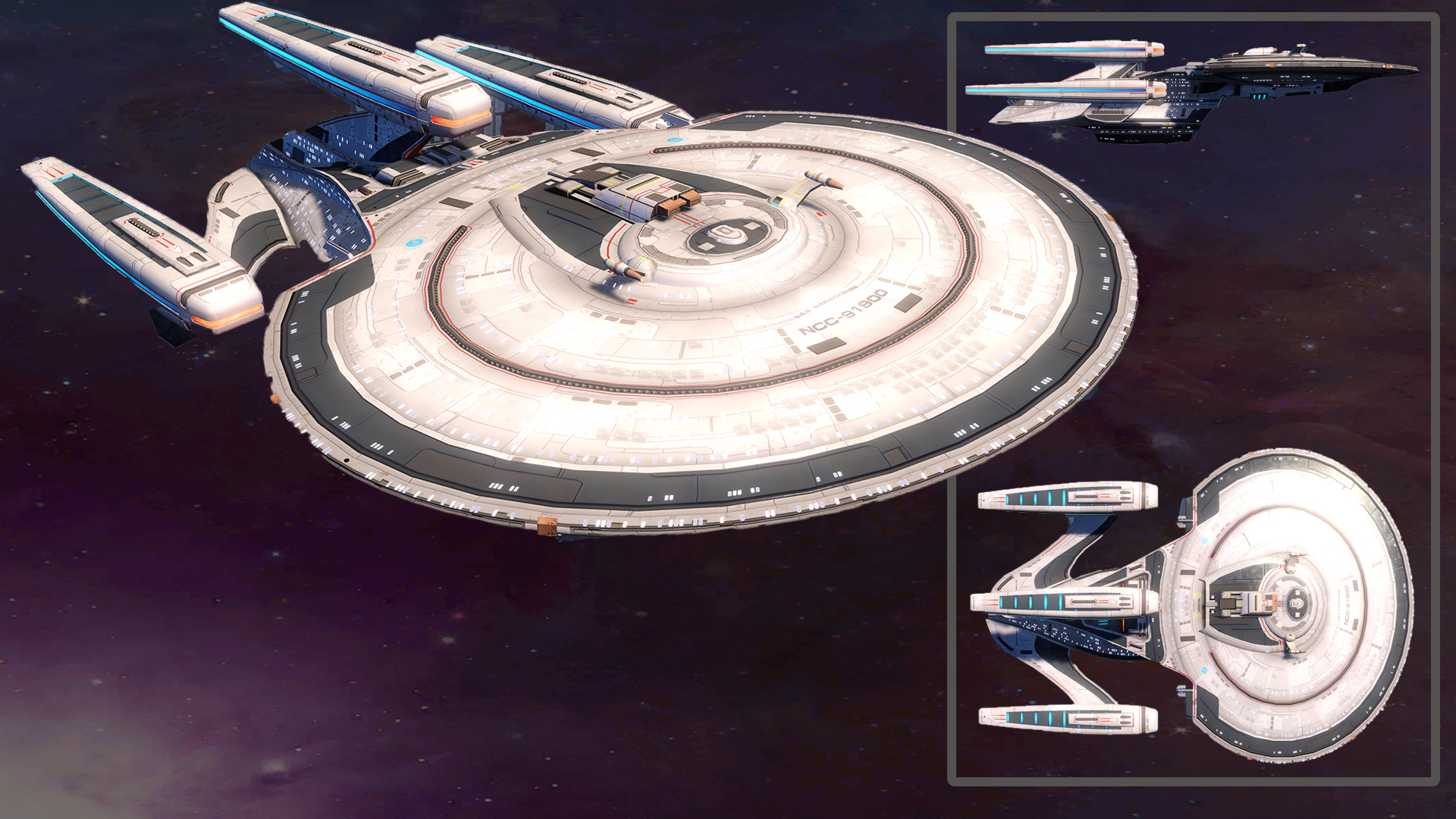 SKIN UNLOCK: Free Though similar in layout to the Galaxy, the Monarch class takes on harder edges, banked nacelles, and other structural changes throughout the spaceframe, incorporating lessons learned from its older siblings' 50 years of service. |